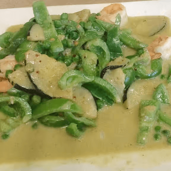 Stir-fried with red curry (coconut milk), bamboo shoots, bell peppers, and mushrooms. Mild spicy