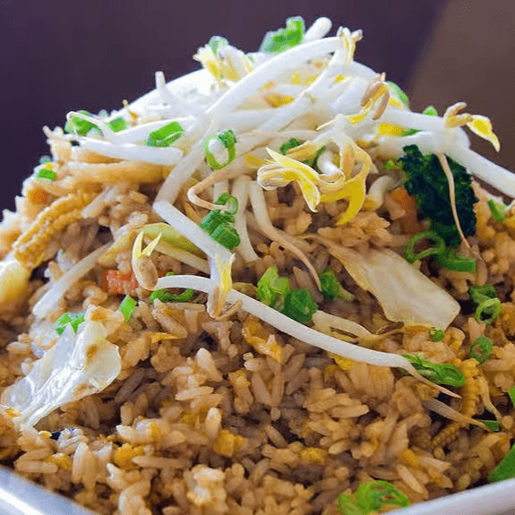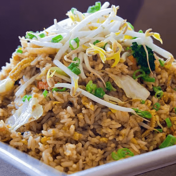 Fried rice with egg, broccoli, baby corn, water chestnut, carrot, cabbage and bean sprout