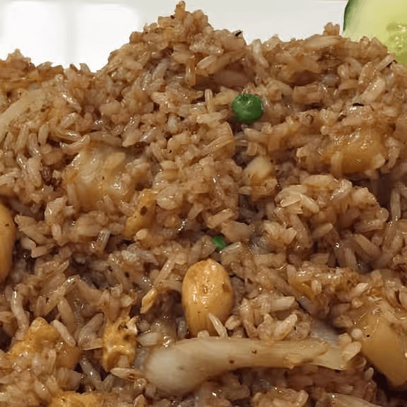 Fried rice with egg, pineapple, onion, tomato, peas and cashew nuts