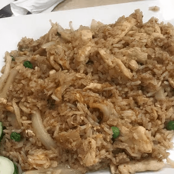 Fried rice with egg, onion, green onion, fried garlic, and black pepper. Mild spicy