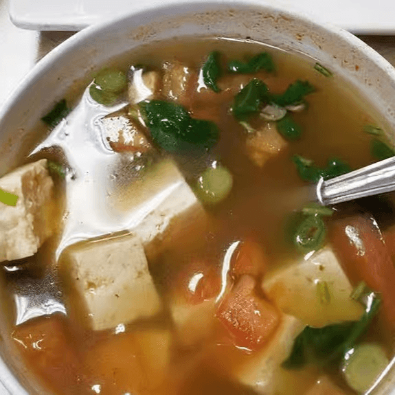 Dinner only. Thai's favorite clear soup with mushroom, tomato, lime leaves, lemon grass, lemon juice, with just a touch of chili paste. Topped with green onion and cilantro